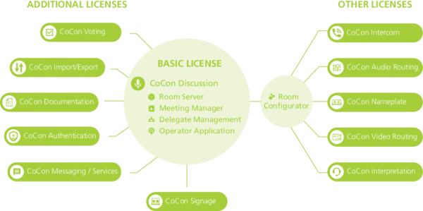 Before you can start using CoCon, you need a license issued by Televic. Different license modules are available depending on the functions your conference system requires. These range from basic functionality to a full-blown CoCon software package containing all possible CoCon functionality. The image below shows an overview of all available licenses.