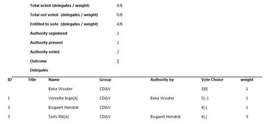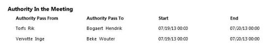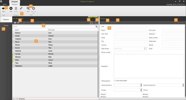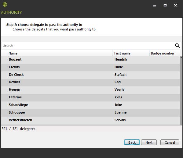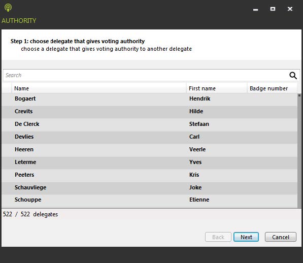 This part of the Delegate Management-ribbon allows you to create authority passes. This means that one delegate gives his voting right (and weight) to another delegate for a certain period of time or the duration of a meeting.