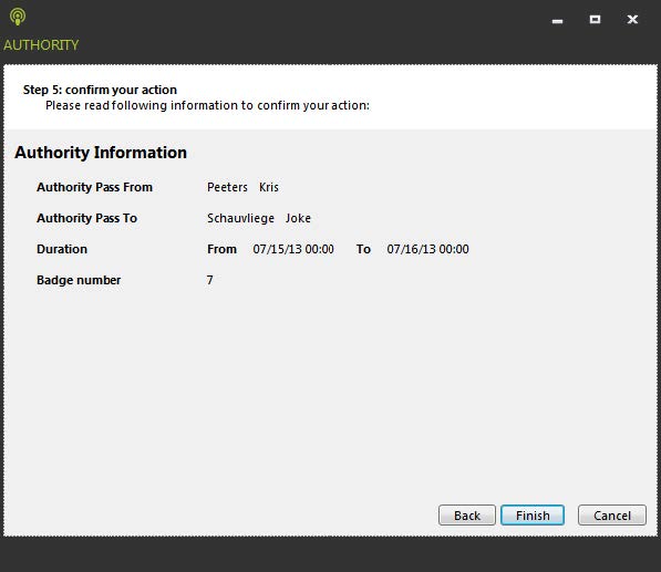 This section describes how to create a voting authority pass. Click Add authority pass/Delete authority passto create an authority pass, a new window opens. There are 5 steps in the creation of an authority pass: