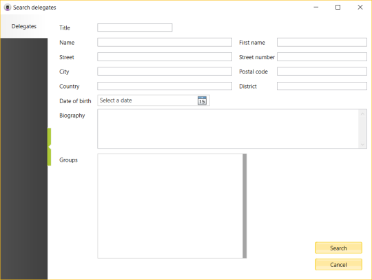 Click the Add button to add a new delegate: this creates an empty delegate. Complete the delegate details in the section on the right of the screen. You can also add delegates by pressing CTRL+N on the keyboard.