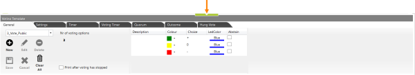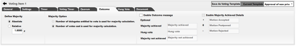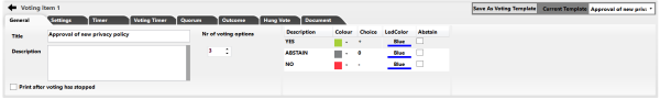 In CoCon you can save the voting settings to a voting template. The database contains a collection of these items, which are available when creating new voting agenda items. On installation, a number of default voting templates are already available in the database.
