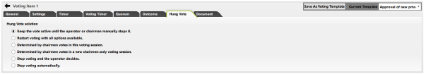 A hung vote is defined as a non-conclusive vote. This means that more than one vote option has the required number of votes to reach the majority. In this tab, you can define what should happen if this situation occurs.