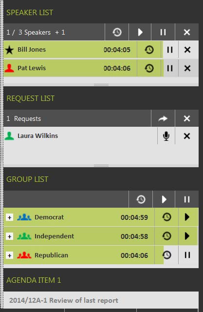 Below the speaker and request list you can find the Group list. If delegates are part of a group, this list shows all of these groups. The list shows the various groups are present in the meeting. Click the + in front of the group to see which delegates are present of this group in the meeting. When group timers are active, you can see the remaining speech time as a green progress bar. The controls for the speech timers are the same as described in "Speaker and request list" on page 1.