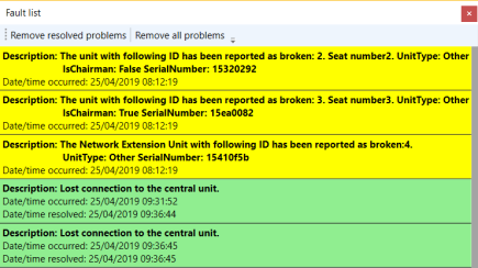 By clicking “Faults” a pop-up appears with a list of faults. The ones in green are resolved problems. By clicking “Remove all problems” you can clear the list. Clicking “Remove resolved problems” only clears the “green” problems. When a problem occurs the “Faults icon” turns red and a message appears. See figures below.