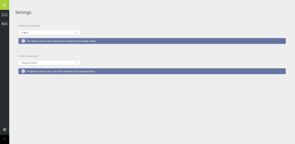 In the Signage application, you have the option to configure the language of your interface as well as the language of the signage screen. This means that you can have two different languages in your application. You can configure the signage templates in one language, while the content on the signage screen can be in a different language.