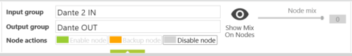 Per enabled node you can define the volume of the input or output group in the mix. To change the volume use the scroll bar in the Node status section. When you click Show Mix On Nodes, the volume will be displayed next to every node in the matrix.