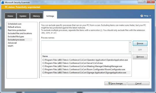 - All applications: Some version of Windows Defender and Microsoft Security Essential can cause a significant delay in the communication between the Central Unit and the CoCon Room Server on the one hand, and between the CoCon Room Server and the CoCon clients on the other hand. This can be seen by the fact that the “MsMpEng.exe” process takes a lot of CPU in the Windows Task Manager section Processes while the CoCon applications are running. The solution for this is adding exceptions for the CoCon Room Server and CoCon clients on the management consoles of these Microsoft programs, as shown in the screenshot below for the Microsoft Security Essentials: