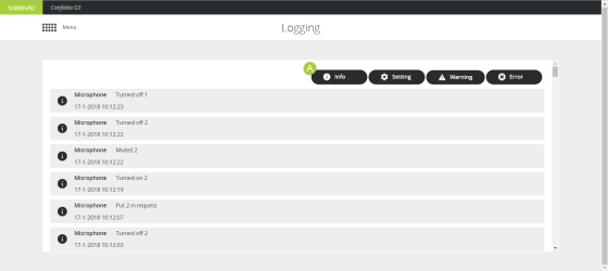 ) from the main menu. You can use the logging screen as a monitoring or analysis tool when certain problems occur . This page captures every event , change of settings , warning and other messages. You can easily filter which messages you want to see by clicking the message button on top of the page (A).