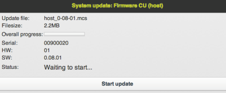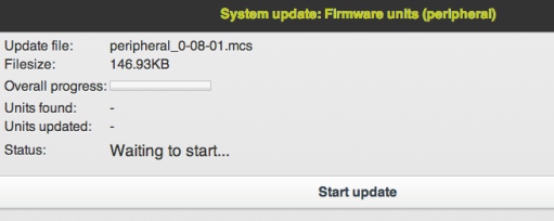 Then again a new screen is shown where the status says “Waiting to start…”. Press “Start update”. The update takes a couple of minutes. During the update the light ring of the delegate units should blink and after completion the total number of update units should correspond with the actual number of units connected to the central unit. If this is not the case it is advised to do the same update procedure a second time. (Again restart both Central Unit and webbrowser).