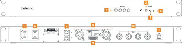 - Headphone connector: plug in headphone to check all audio input (audio over Dante™ and audio from the auxiliary audio inputs). Select the channel and adjust the volume using the web server.
