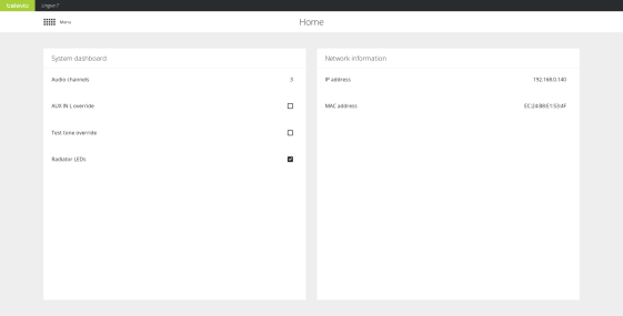 The Home screen is the landing page of the transmitter. This page shows a summary of the most important parameters, some of which you can adjust here or click the parameter to go to the page where you can configure them. Two group of settings are available: the System dashboard settings and the Network information settings.