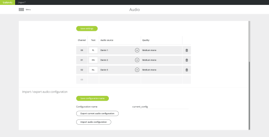 It is possible to import and export audio configuration settings. Define the Configuration name and click Save configuration name to confirm. Click Export current audio configuration to export the settings or Import audio configuration to import settings.