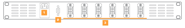 The 230 V mains is connected to the power supply through a male connector (1) at the back of the power supply. A power good TTL output on a D9 connector (2) allows you to check whether the power is okay. Six female Phoenix connectors (3) are available to branch off the 48 V.
