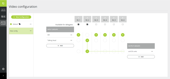 In the application you can define the video input and create input groups ( shown on the left side of the figure). In the middle you can see the six available video streams, you can change the name of each of these streams. Disable streams by unchecking the option Available for delegates, these streams will not be available for the V-SEL.