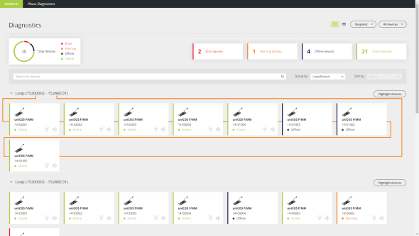 In the Diagnostics application, you can group devices based on the loop/branch they belong to. With this option, you can see when a loop is broken because then the loop becomes a branch. To see the loops/branches select Loop/Branch under Group by next to the search bar.