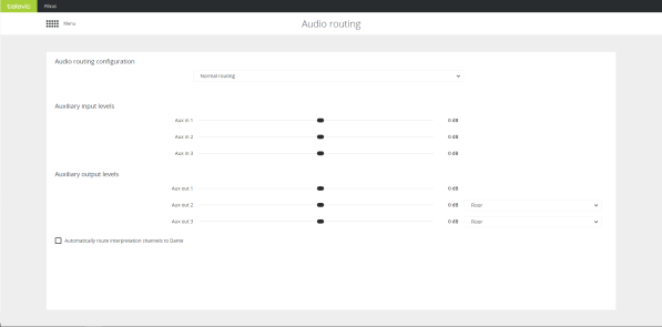 With audio routing you can control all routing configurations and the auxiliary levels. You can configure the following settings: